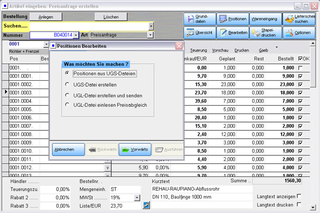 Über die UGL-Schnittstelle können Preisanfragen an die Lieferanten erstellt und gesendet werden. Die Preisangebote der Händler werden ebenfalls über UGL wieder eingelesen.
