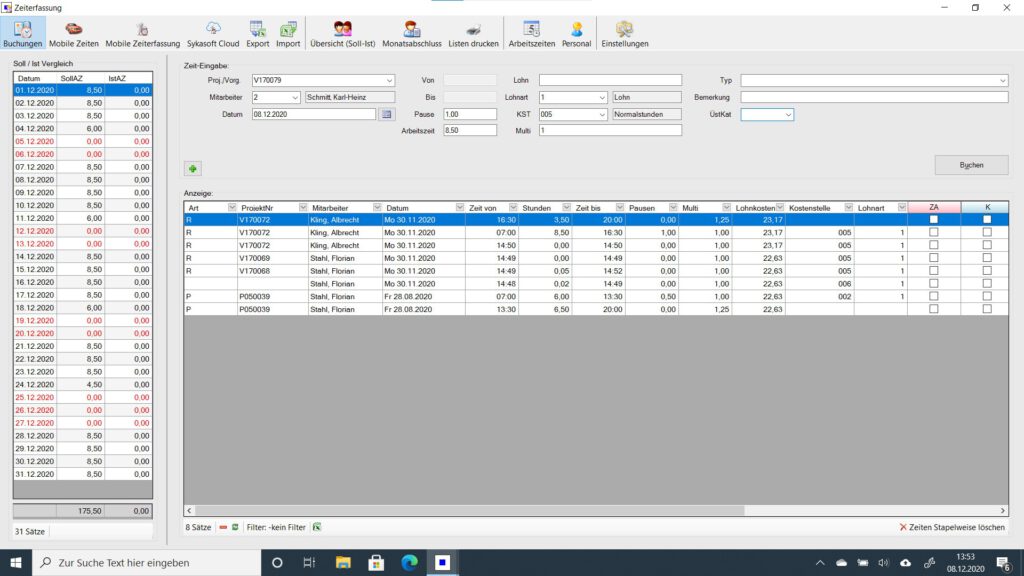 Zeiterfassung (Büro) – für das Erfassen und Auswerten der Monteureinsätze. Verschiedene Arbeitszeitmodelle, Übersicht über die Einsätze, Soll-Ist-Auswertungen, Monatsabschluss. Zeiten aus mobilen Apps. Automatische Abrechnung der Zeiten im Regieauftrag. Schnittstelle zur Lohnbuchhaltung. Zeiterfassung lohnt sich!