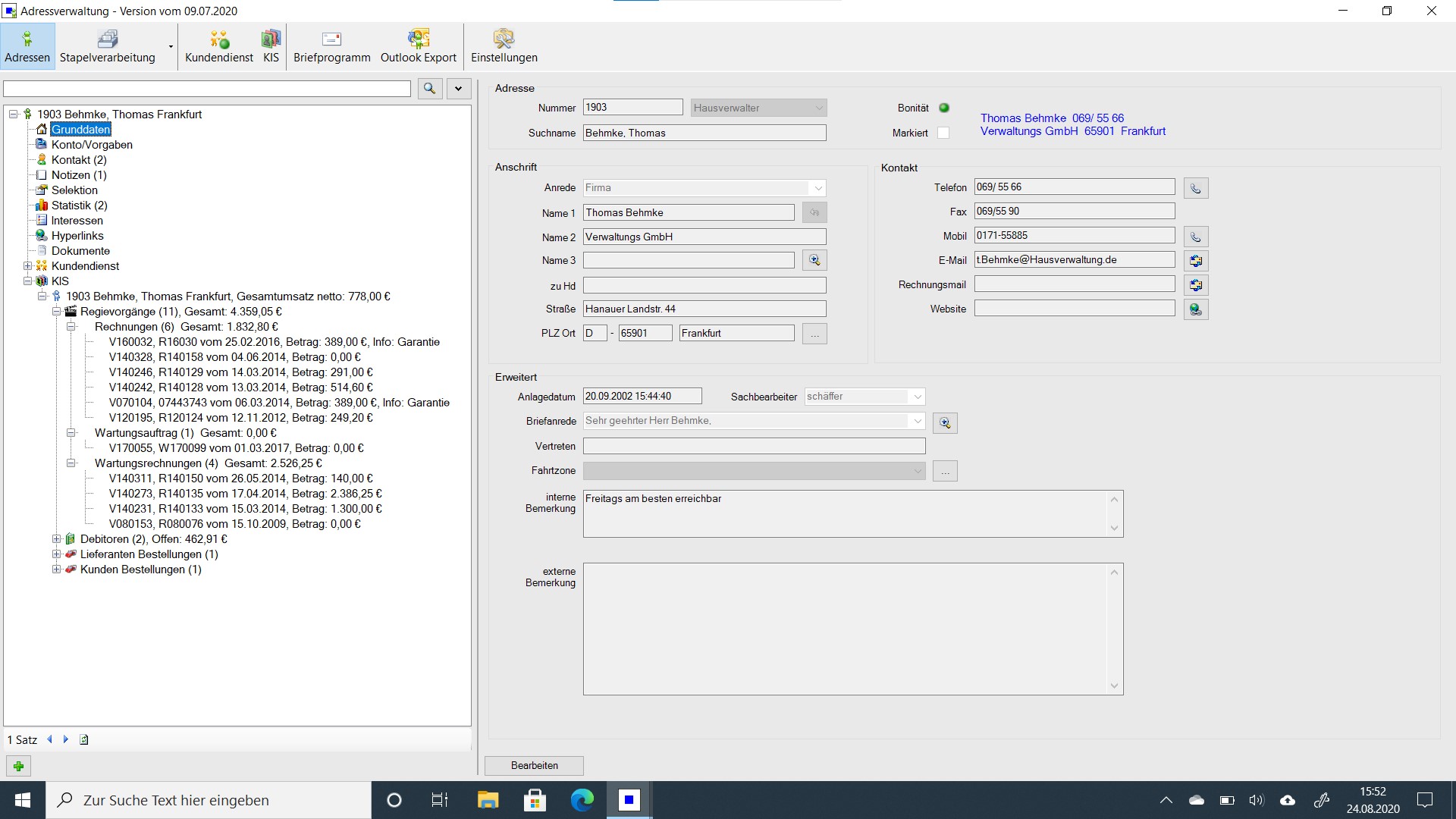 Adressen und weitere Daten von Kunden, Lieferanten, Personal. Mit Bank- und Buchungsdaten und Bonitätsanzeige. E-Mail, SMS, Fax und Computertelefonie direkt aus dem Programm. Beliebig viele Telefon- und Faxnummern. Kommunikation mit einem Klick.