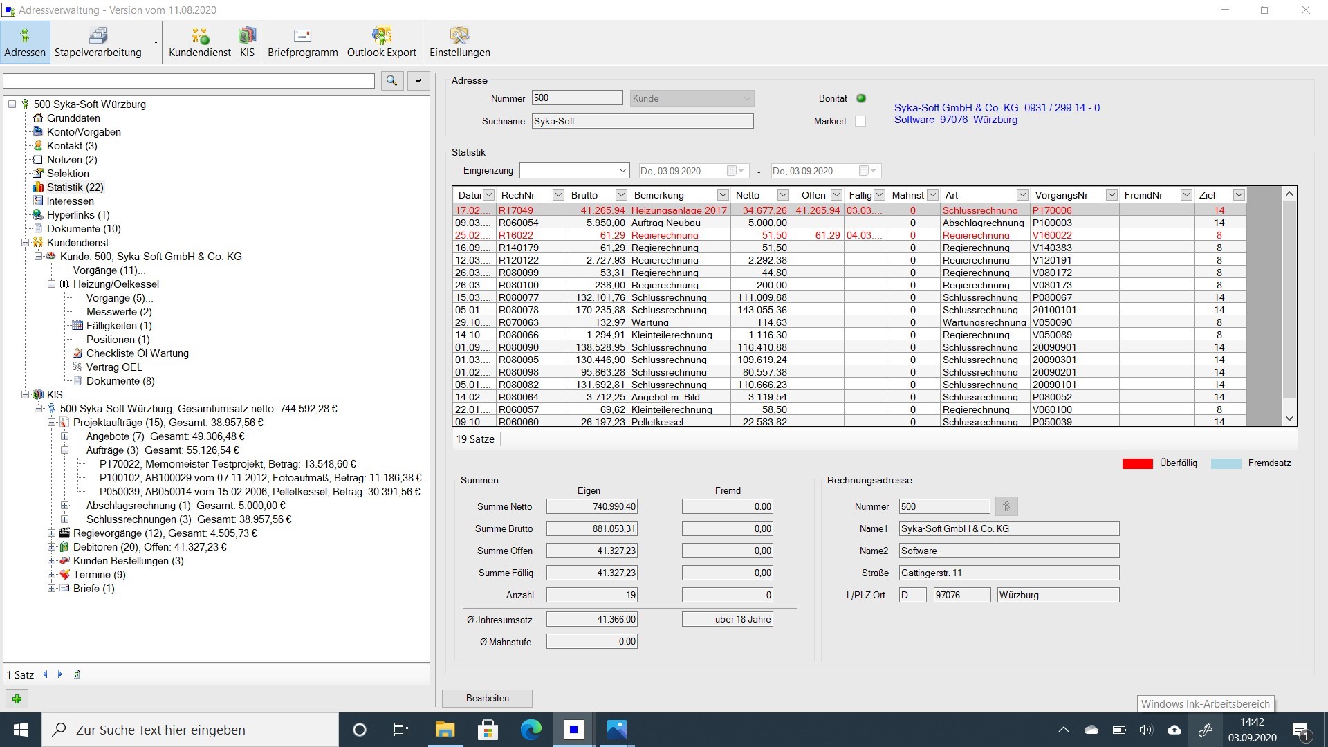 Umsatzstatistik der geschriebenen Rechnungen zur Adresse. Notizen und Wiedervorlage mit Erinnerungsfunktion. Für die interne Kommunikation.