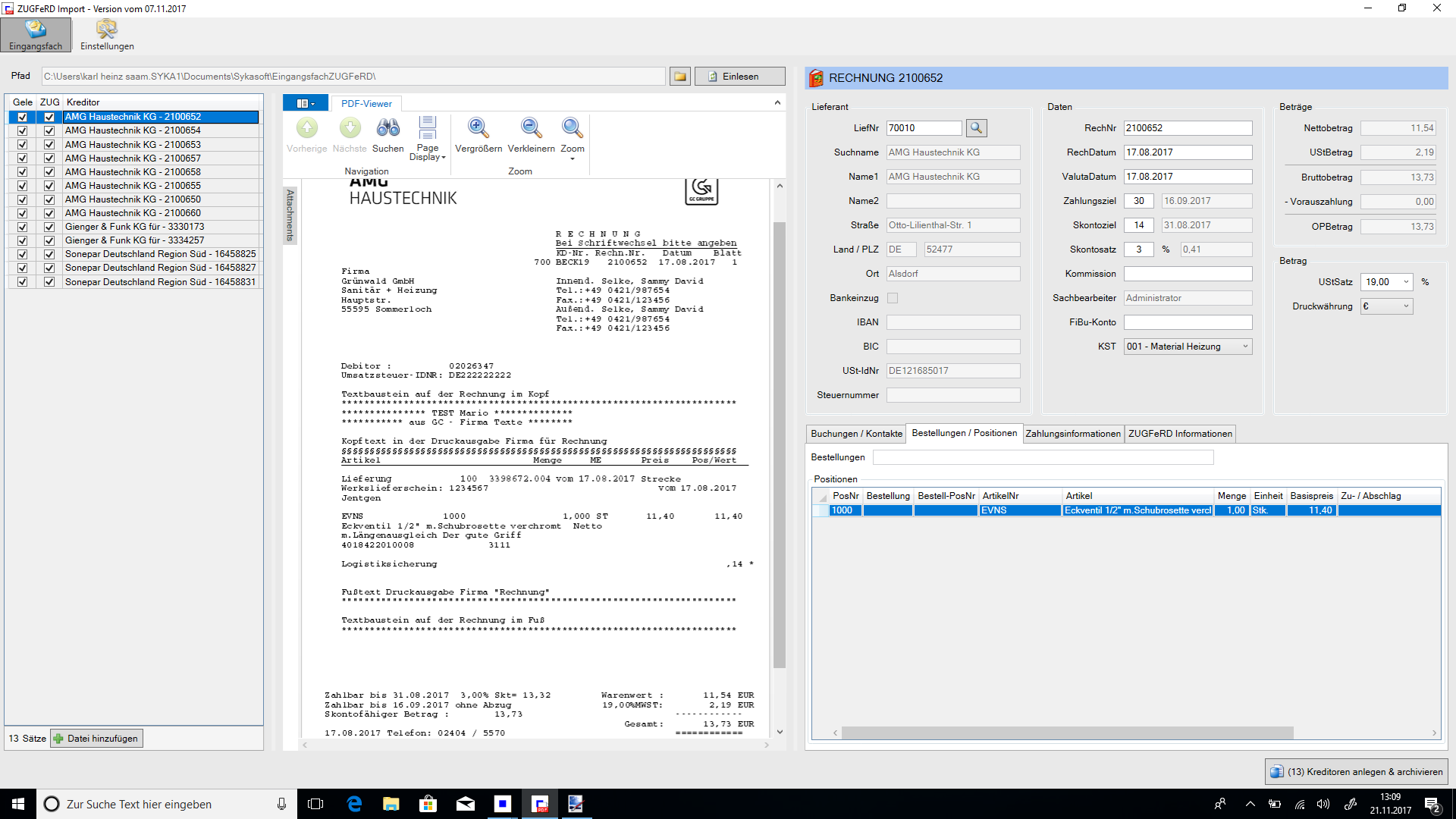 • Im ZUGFeRD Eingangsfach (anzuwählen über Kreditoren oder das Docbox Eingangsfach) werden die Rechnungen gesichtet. Neben der PDF Dokumentenvorschau werden die daraus ausgelesenen XML Daten dargestellt (Datenvorschau). Dies ermöglicht den direkten Vergleich der Druckversion und der integrierten XML-Daten. Über die Ust-ID wird die Zuordnung zu Kreditoren hergestellt; neue Adressen werden automatisch angelegt. Bei vorhandenen Bestellungen wird automatisch geprüft, ob die Preise stimmen.