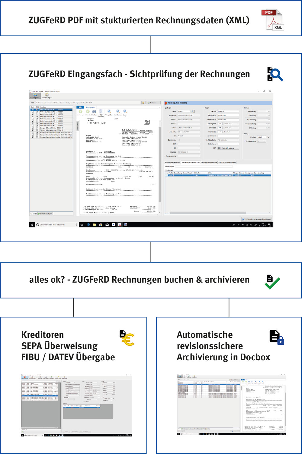 • Nach erfolgter Sichtprüfung können die ZUGFeRD Rechnungen mit einem Klick in den Kreditoren gebucht und gleichzeitig in Docbox revisionssicher archiviert werden.